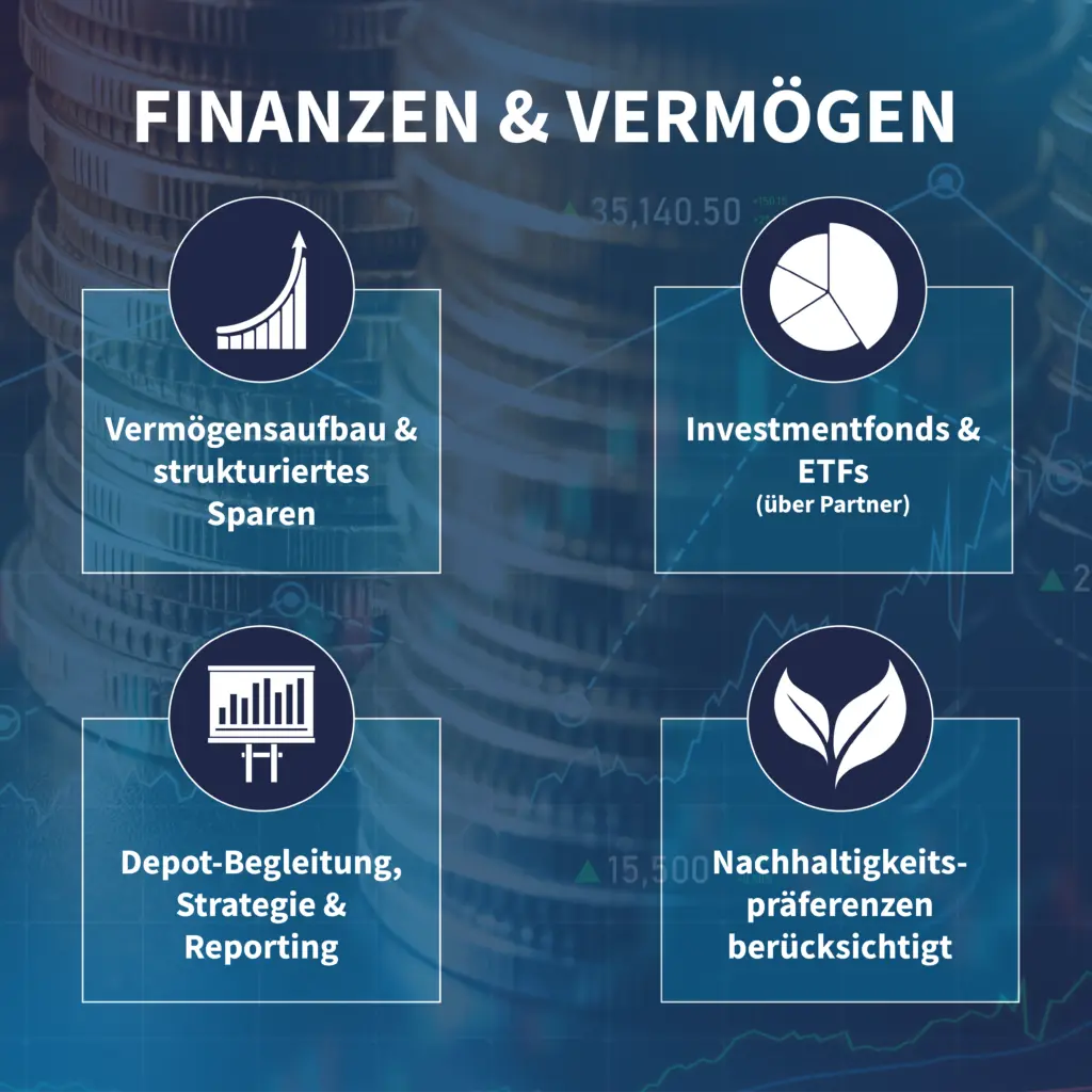 Von der Absicherung über Vermögensaufbau bis hin zu Immobilien und strategischer Planung begleiten wir Sie mit einem klaren System – verständlich, strukturiert und langfristig gedacht.